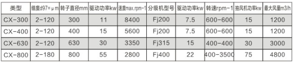 CX-1超細(xì)粉碎機廣泛的適應(yīng)性不僅是由于具備機械式柔和破碎以及大量空氣流動形成的冷磨效果,同時也歸功于氣流分級機具有優(yōu)越的分級性能,分級性能如下: